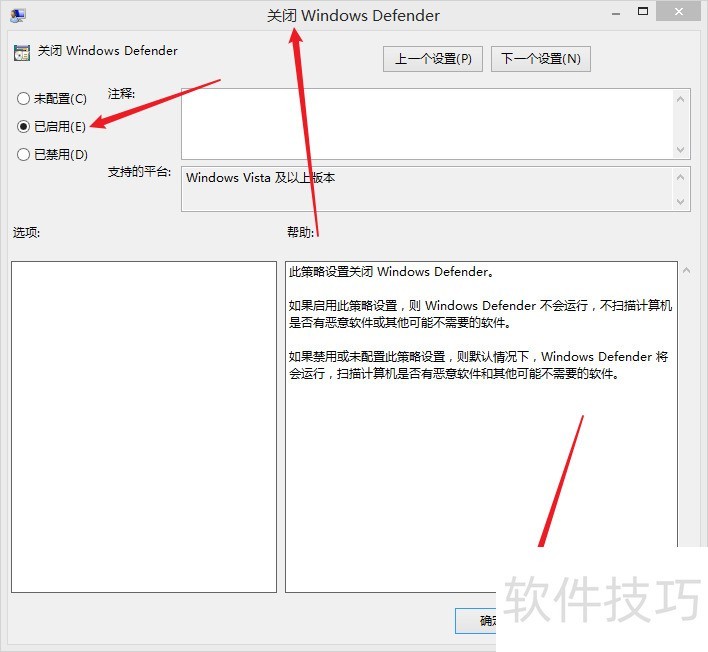 5、 双击关闭windows Defender 将配置改为已启用