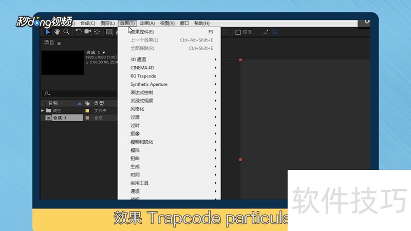 5、 点击“新建”、“纯色”、“效果”、“Trapcode”、“Particular”。