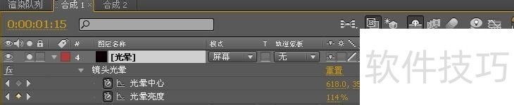 2、 建立固态层命名光晕,添加镜头光晕特效,为光晕的中心和亮度设置关键帧,如下图所示,光晕的位置由左向右移动,亮度开始为0,中间为110%,最后为0。