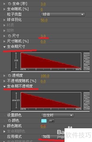 3、 新建固态层命名粒子,添加particular特效,设置参数,发射器每秒的粒子数设置关键帧,两秒设置为400,两秒一帧设置为0,给位置xy添加表达式,目标设置为光晕的位置,让粒子随着光晕移动(光晕的层模式设置为屏幕)。继续更改参数如下图所示