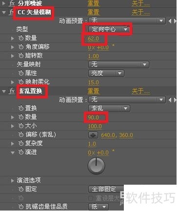 6、 给每层不同颜色的粒子复制一层,改名为光线,把发射器下的速度设为0,这样粒子就成为一条线,改变他们的位置紊乱值,粒子数量,粒子生命值等参数,使每条光线效果都不一样,效果如下图所示7可以给光晕换一种颜色,选择色相位/饱和度和曲线特效,添加给光晕层。添加云雾背景效果,新建固态层命名云雾,给层添加分形噪波,设置层的混合模式为屏幕,设置参数如下图所示,给演变和乱流偏移添加表达式,分别设为time*100?和[time*50,0]8继续给云雾层添加CC矢量特效和紊乱置换特效,让云雾效果更精彩,设置参数如下图所示