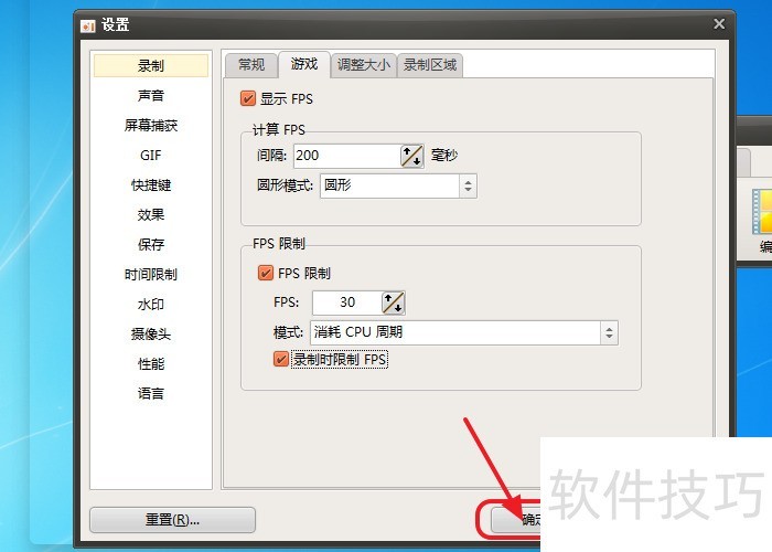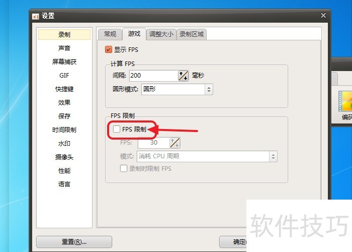 6、 然后继续勾选【录制时限制FPS】。