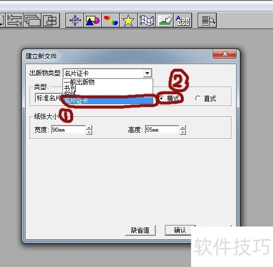 1、 ? ? 首先先打开蒙泰软件,在打开页面里点击“文件”-“新建”,在弹出的对话框里最上面的那个下拉菜单里选“名片”(红色圆圈1的部分)。然后在版式里选“横版”(红色圆圈2的部分1)。