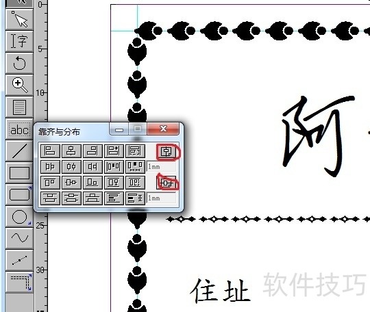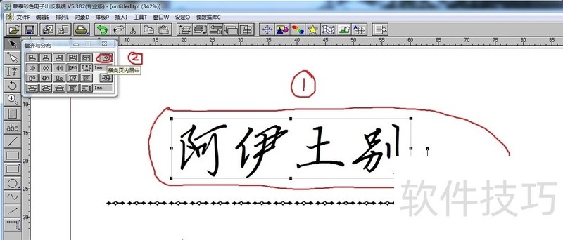 16、 ? ? 看到图中红色圆圈里的部分的按钮了吗?用这两个功能可以把这几条设置好的文字进行对齐设置了(其央恩实这个也不难,你只要把鼠标放在某一个按钮上一小会就能显示这个按钮是什么功能了)。17? ? 用shift键全部选中人名、竖线和头衔部分,用横向居中工具将其居中。