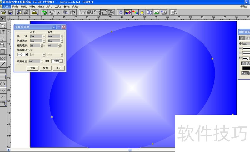 6、 点击椭圆形图标,画出一个直径比矩形直径小些的圆形,调整好大小。7按快捷键“Ctrl+M”,出现变换与复制框。设旋转角度为10,点变换。