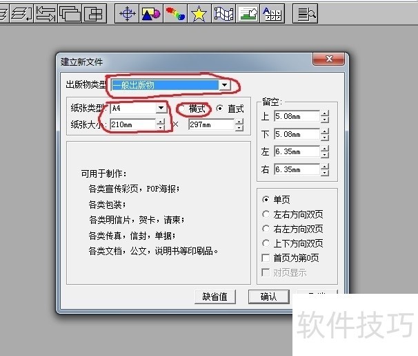 4、 ? ? 在弹出的对话框里选择所编辑图象的类型,选择“一般出版物”,纸张选择“A4”,版式选择“横式”,下面的尺寸不用更改,用系统默认的就可以了。