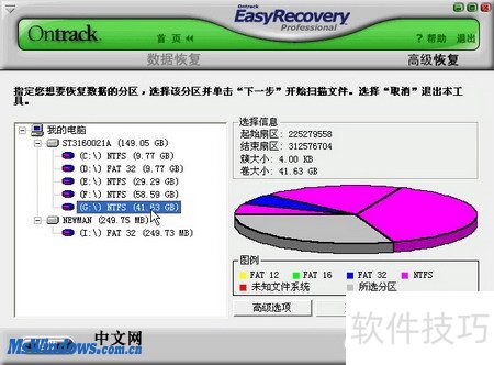 4、 进入“高级恢复”窗口,左窗口中列出了程序扫描到的电脑中现有的硬盘分区和其他存储器。单击选中想要恢复数据的分区,并单击“下一步”按钮,如图2010041620所示。?