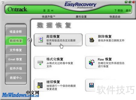 1、 在开始菜单中依次单击“所有程序”→EasyRecovery Professional→EasyRecovery Professional菜单项,打开程序主窗口。2在程序主窗口的功能导航栏中单击“数据恢复”按钮,然后在窗口右侧单击“高级恢复”按钮,如图2010041618所示。?