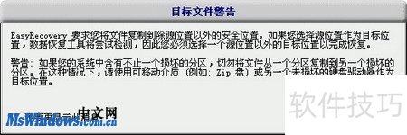 3、 程序开始扫描系统,随后会打开“目标文件警告”对话框,提示用户将恢复得到的文件复制到源位置以外的安全位置,即其他分区或移动存储器。单击“确定”按钮,如图2010041619所示。?