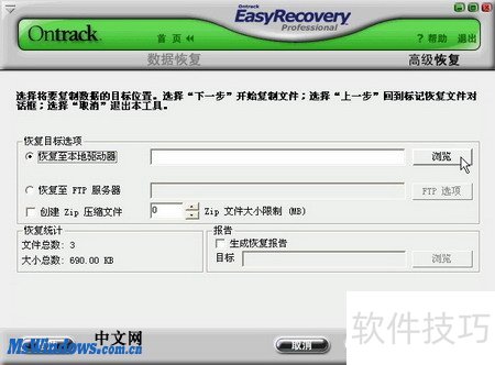 7、 接着需要选择恢复得到的文件的保存位置。选中“恢复至本地驱动器”单选钮,并单击右侧的“浏览”按钮,如图2010041623所示。?
