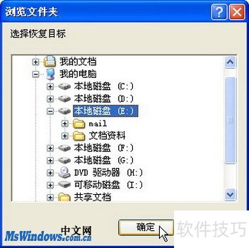 8、 打开“浏览文件夹”对话框,选中文件的保存位置。在这里尤其需要注意,不能选择文件的源分区作为目标位置。完成选择后单击“确定”按钮,如图2010041624所示。?