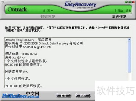 9、 返回“高级恢复”窗口,单击“下一步”按钮。程序开始尝试恢复选中的文件,根据选中文件的大小,恢复过程所需要的时间会有所不同。完成恢复后会打开“恢复摘要”窗口,用于显示恢复结果。最后单击“完成”按钮,如图2010041625所示。?