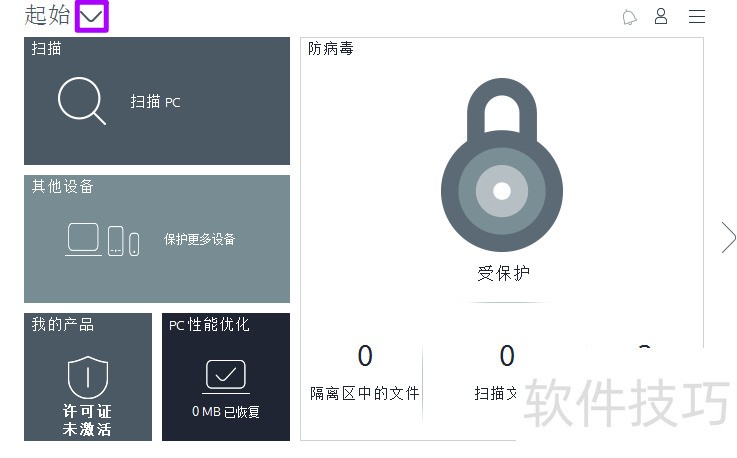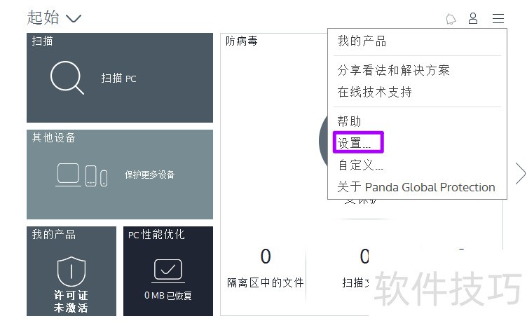 1、 打开电脑中所安装的“熊猫卫士”,点击“起始”菜单后面的小三角图标展开下拉框。