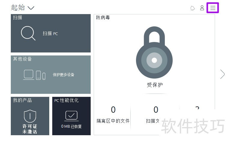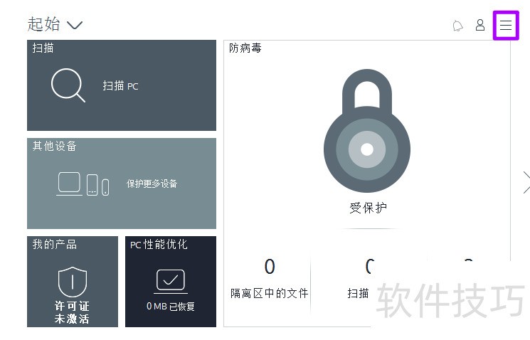 1、 打开电脑中所安装的“熊猫卫士”,点击右上角的三条横线图标展开菜单。