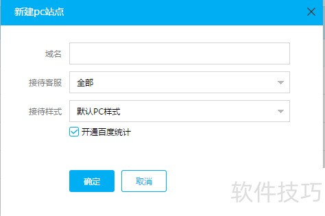 6、 然后输入需要统计的站点域名,依次按照选择填写好域名、接待客服、接待样式后点击确定,ps:如果没有特殊的情况可以直接默认,后续都可以调整。