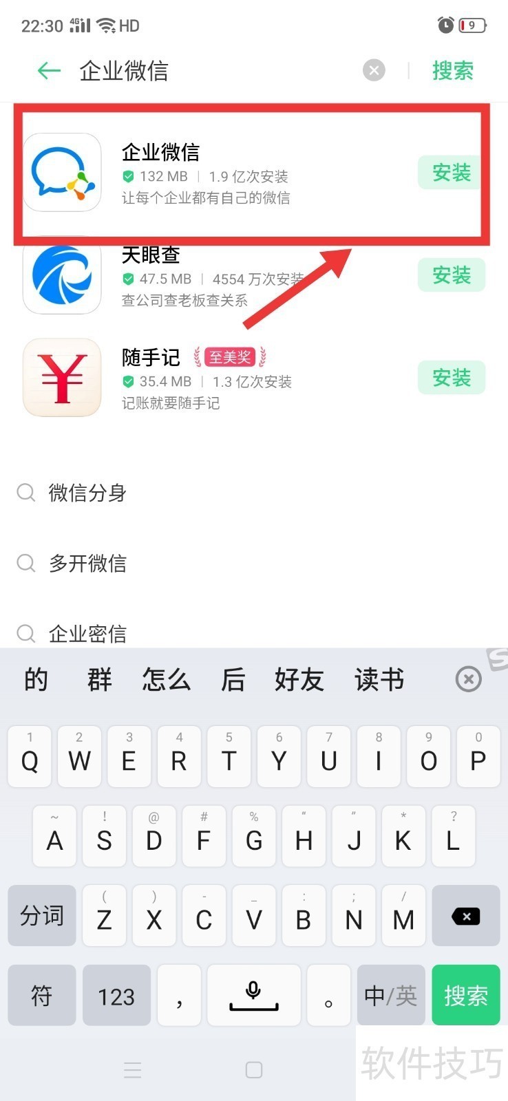4、 点击后,在搜索结果中找到【企业】并点击【安装】。