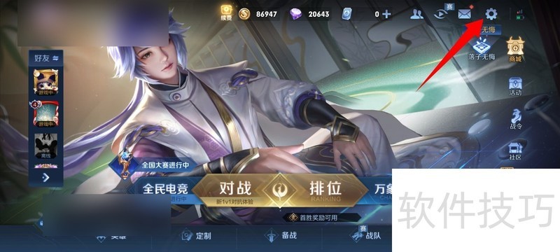 1、 进入王者荣耀首页,点击右上角的设置选项。