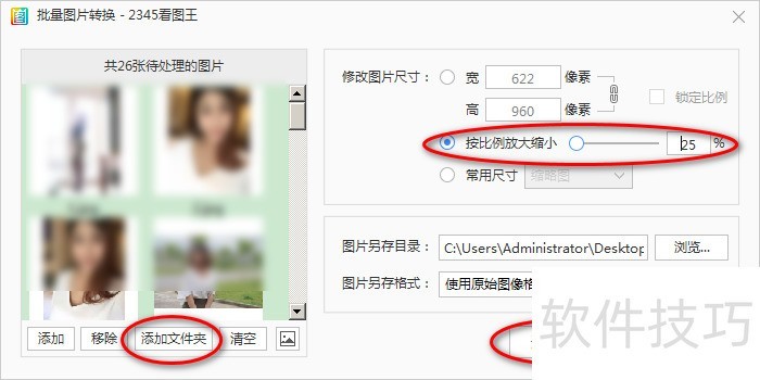 4、 弹出批量图片转换窗口,点击添加文件夹按钮,选中按比例放大缩小25%,点击开始转换按钮。