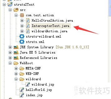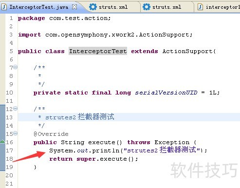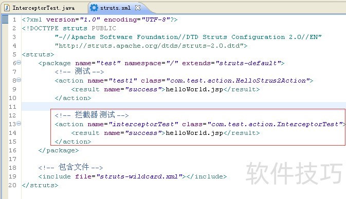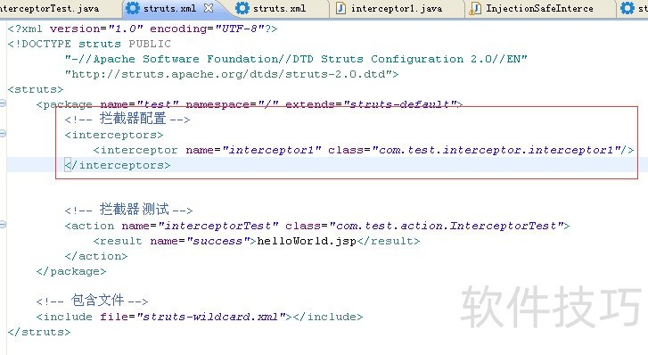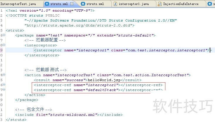 5、 接下来做拦截器配置<interceptors>? <interceptor name="inteceptor1" /></interceptors>定义了拦截器的名称叫做inteceptor1,实现类为 com.test.interceptor.interceptor1