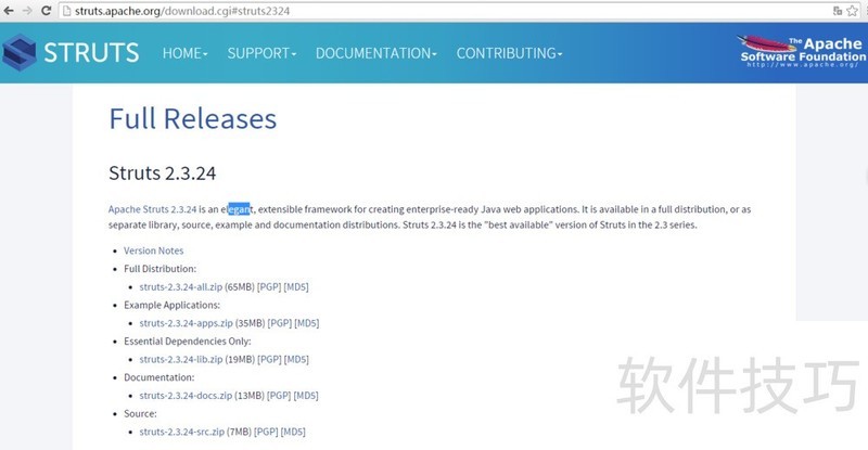 1、 去官网下载struts2,需要用到的是full distribution,根据需要也可以下载诸如文档doc和源代码source等。