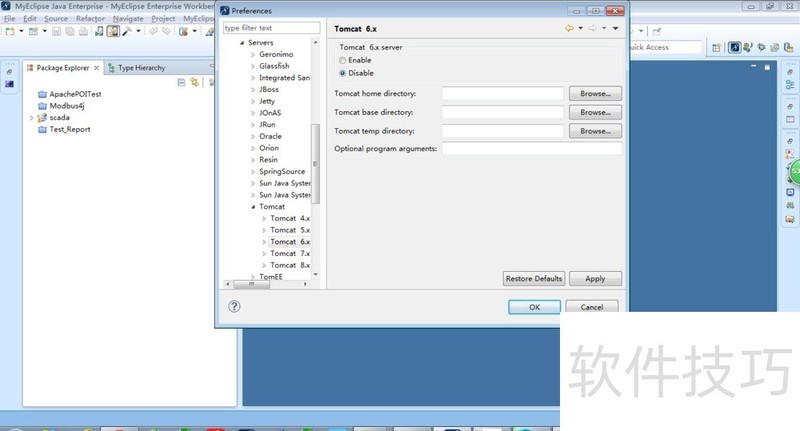 3、 在MyEclipse中配置服务器,此处以tomcat为例,进入MyEclipse,工具栏中选择windows,然后选择preference,然后选择MyEclipse->Servers->Tomcat,然后选择对应的Tomcat版本你你对应的安装地址。