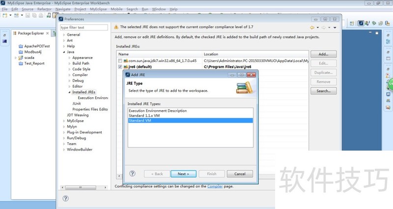 4、 在MyEclipse中配置jdk,依次选择window –> preferences – >java – >installed jres,如果没有对应的JDK(不是JRE),选择add,选择standard VM -> next,选择JDK对应的Directory。