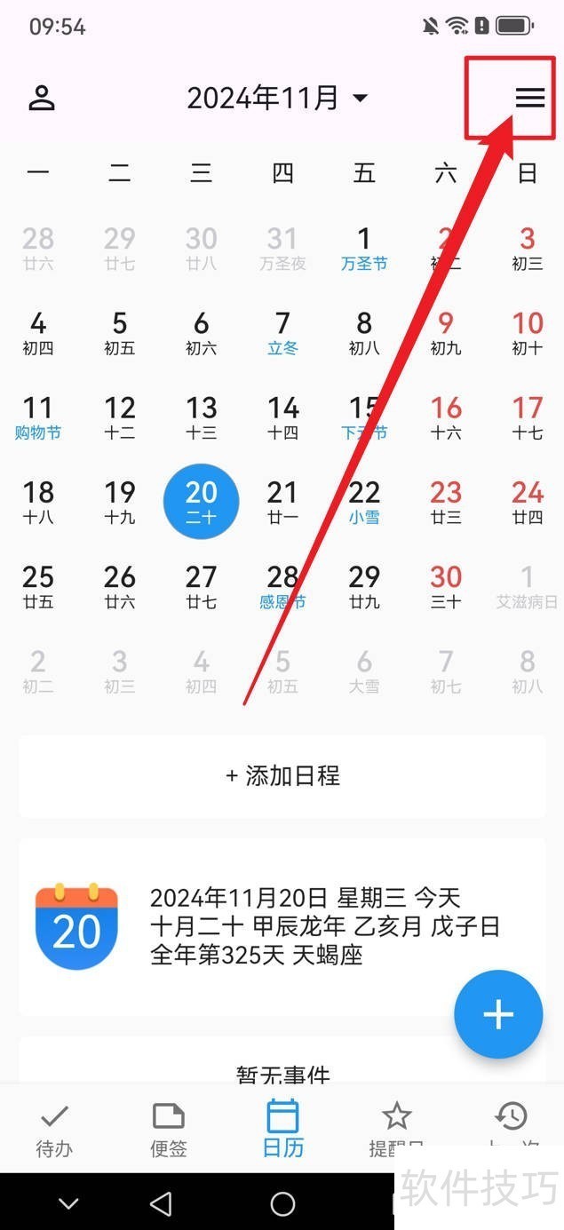 1、 第一步:打开优效日历,点击【三条杠】图标。