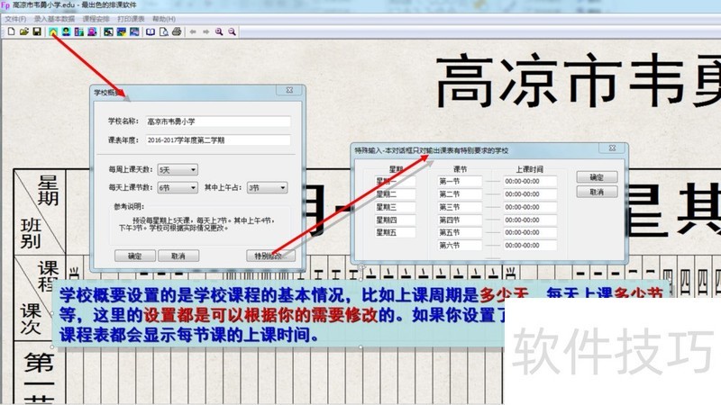 1、 输入学校概要,其中包括校名、年度、周期天数、每天最大上课节数等等,这里的所有文本都可以修改,如:将“星期一”改成“周一”,“第一节”改为“早读”等。需要在课程表中显示上课时间的,也可以在此输入(如下图)。