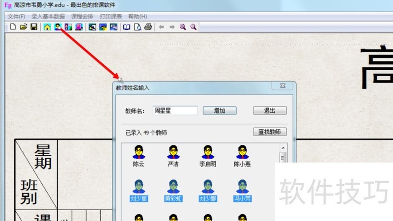 2、 输入教师姓名。在“教师名”输入框输入完一个教师姓名后,点“增加”按钮或直接按“回车键”,即可曾加一位教师。输错名字的可以选择相应图标,修改或删除