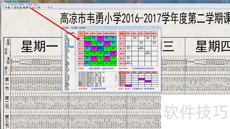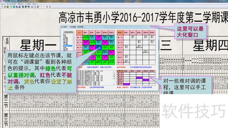 2、 在校正课表对话框,点击“调课窗”任一节课,都可以查看到该节课的全部情况及与该课节课关联的其他资料。如果你认为哪一节课不合理的,你用鼠标左键点击该节课,就可在“调课窗”看到各种颜色的提示,其中绿色代表可以直接对调,红色代表不能对调,黄色代表你设置了禁止,当然还有其他颜色,你可以慢慢领会。
