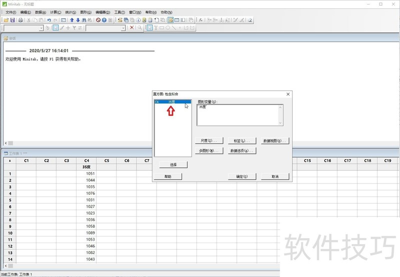 3、 在工具栏依次选择,图形-->直方图,弹出直方图样式窗口,根据需求选择一个样式,通常选择第二种即可。4在弹出的窗口中双击数据所在列C5,C5的数据进入到右边的图形变量区域,参与计算,没有特殊情况其它参数默认即可。