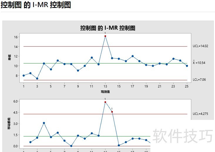 4、 点击确定,就跳出了我们想要的控制图。异常的点用红色标出。