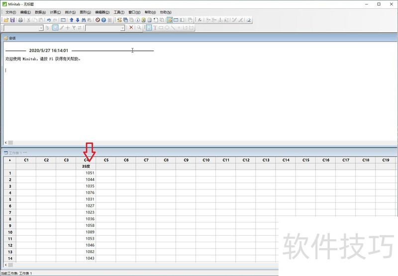 1、 打开minitab,录入数据,注意:数据只能以列排列录入,如果原始数据表是行,转置之后再录入。