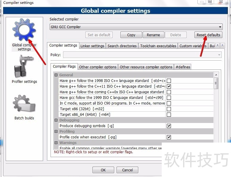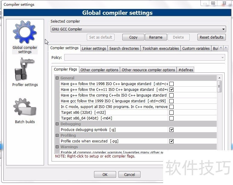 3、 选择左侧“Global compiler setting”-“Selected compiler”项,选择“GNU GCC Compiler”,选择“Toolchain executables”选项。