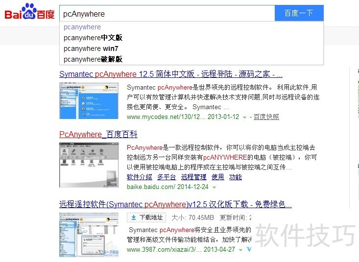 1、 首先打开你的浏览器,直接输入www.baidu.com,进入网络搜索输入pcAnywhere,随便找个可以使用的版本下载下来