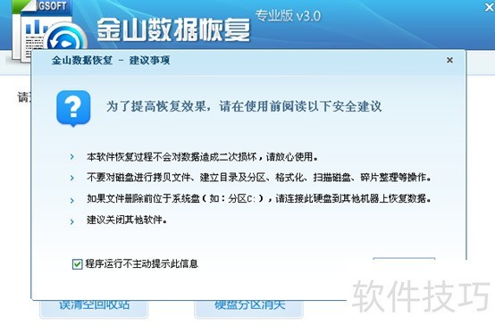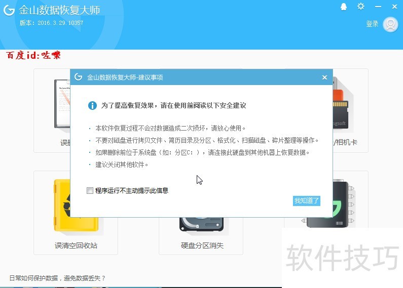 3、 然后在下载数据恢复完成后,再弹出一个金山数据恢复的建议事项,这里我们点击“我知道了”。