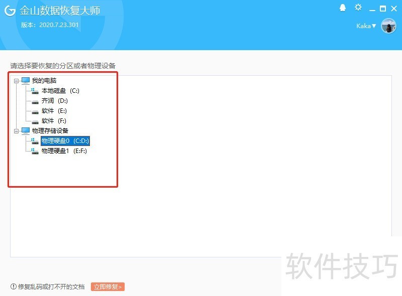 2、 误删除文件打开金山数据恢复大师,找到误删除文件。如图点击