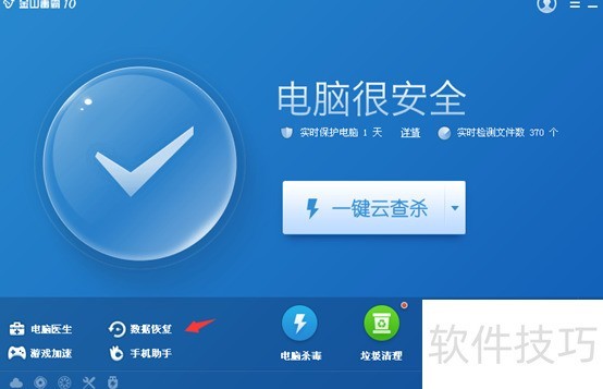 1、 如果电脑上有装金山毒霸那么请打开,然后在金山毒霸面板中找到并点击“数据恢复”。