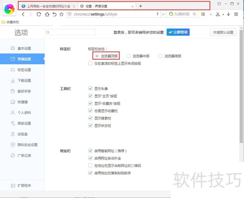 4、 默认标签栏放在浏览器顶部