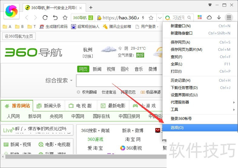 3、 【定义和控制360极速浏览器】下拉选项中选择【选项】