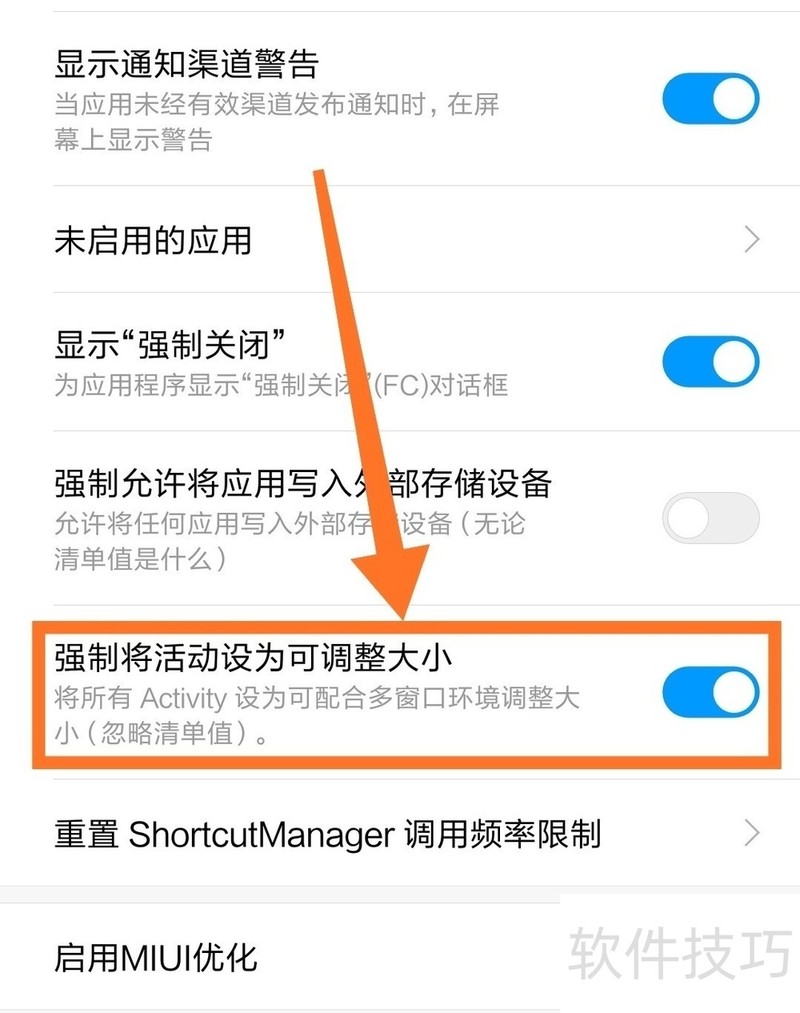 3、 在最底部找到“强制将活动设为可调整大小”并打开。