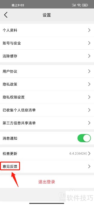 3、 进入设置,点击【意见反馈】。