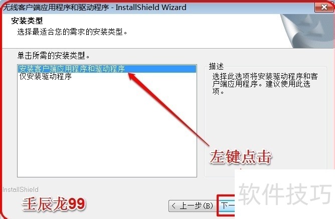 4、 在安装类型窗口,我们点击:安装客户端应用程序和驱动程序,再点击:下一步;
