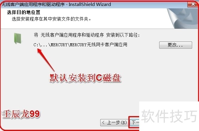 5、 在选择目的地窗口,我们默认安装到C盘(文件不大),再点击:下一步;