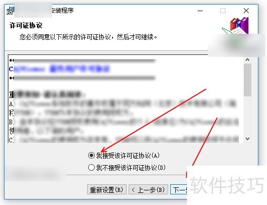 2、 进入到许可协议验证页面,点击“我接受许可协议”的单选框按钮,再点击“ 点击下一步”按钮,以继续安装步骤。