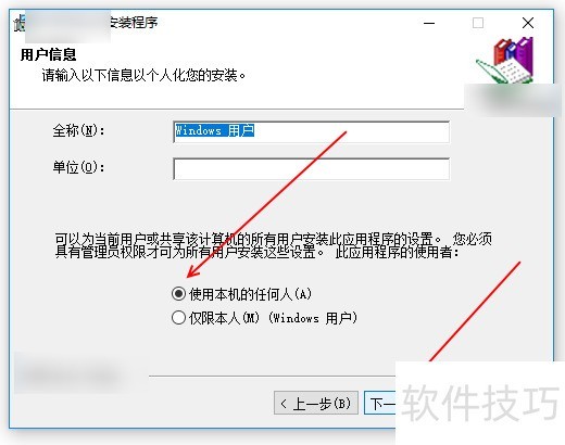 3、 在用户信息界面中,根据自己计算机的操作系统使用情况,选择相应的选项,再点击“ 下一步”按钮,以继续安装步骤。