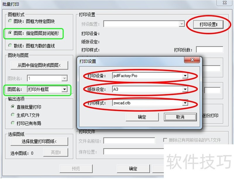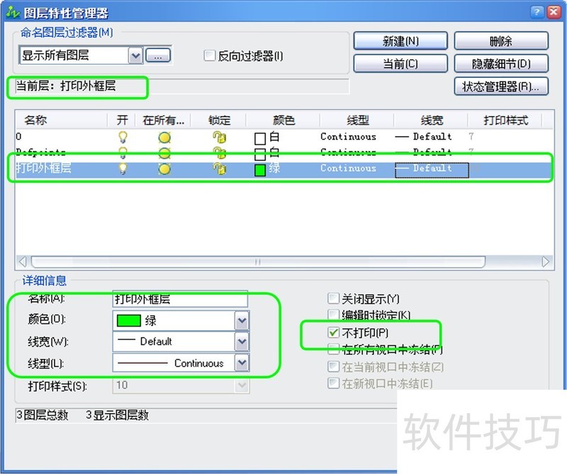 3、 三、批量打印图纸操作方法介绍:图层设置:安装中望CAD批量打印插件和PDF 转换软件后,必须先对CAD 文件图层进行设置。首先,设置一个打印外框层,并设置为不打印,设定为当前图层;然后,将批量打印图框模版中的绿色图框线全设置到打印外框层。图层设置具体如下图所示。?