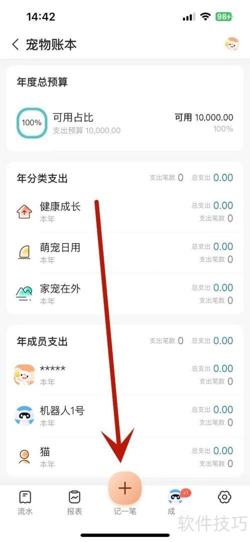 1、 在随手记中找到需要操作的账本,点击记一笔。