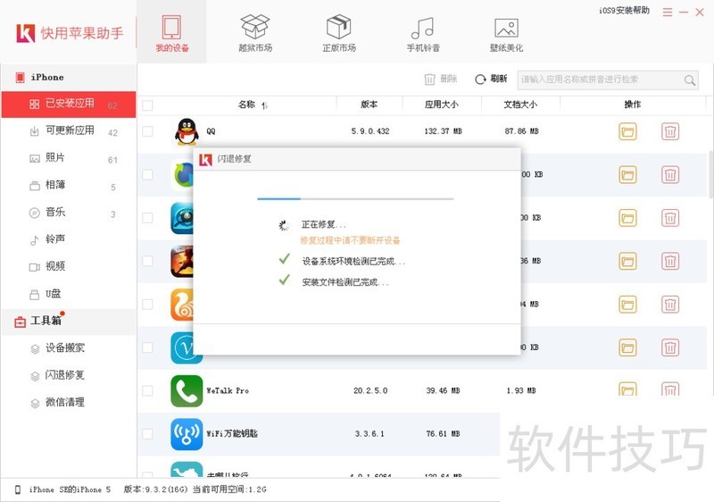 2、 然后在右侧栏目内容工具箱下方打开【闪退修复】,选择开始修复就可以修改闪退的软件了。3注意在修复过程中不要断开设备,以免修复失败,等待修复进度条完毕之后,在拔掉设备查看手机上面的闪退的软件是否修复成功。