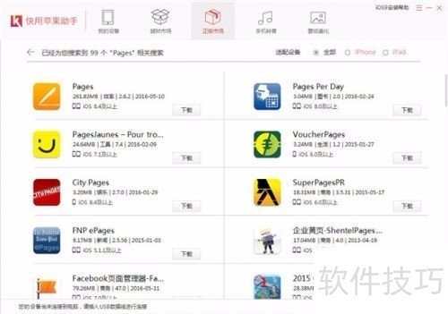 1、 电脑:将设备连接至电脑后,打开【快用苹果助手】。在【搜索】中输入Pages后,等待几秒即可出现该应用的下载信息,点击【下载】后即可将该应用安装至苹果设备上。